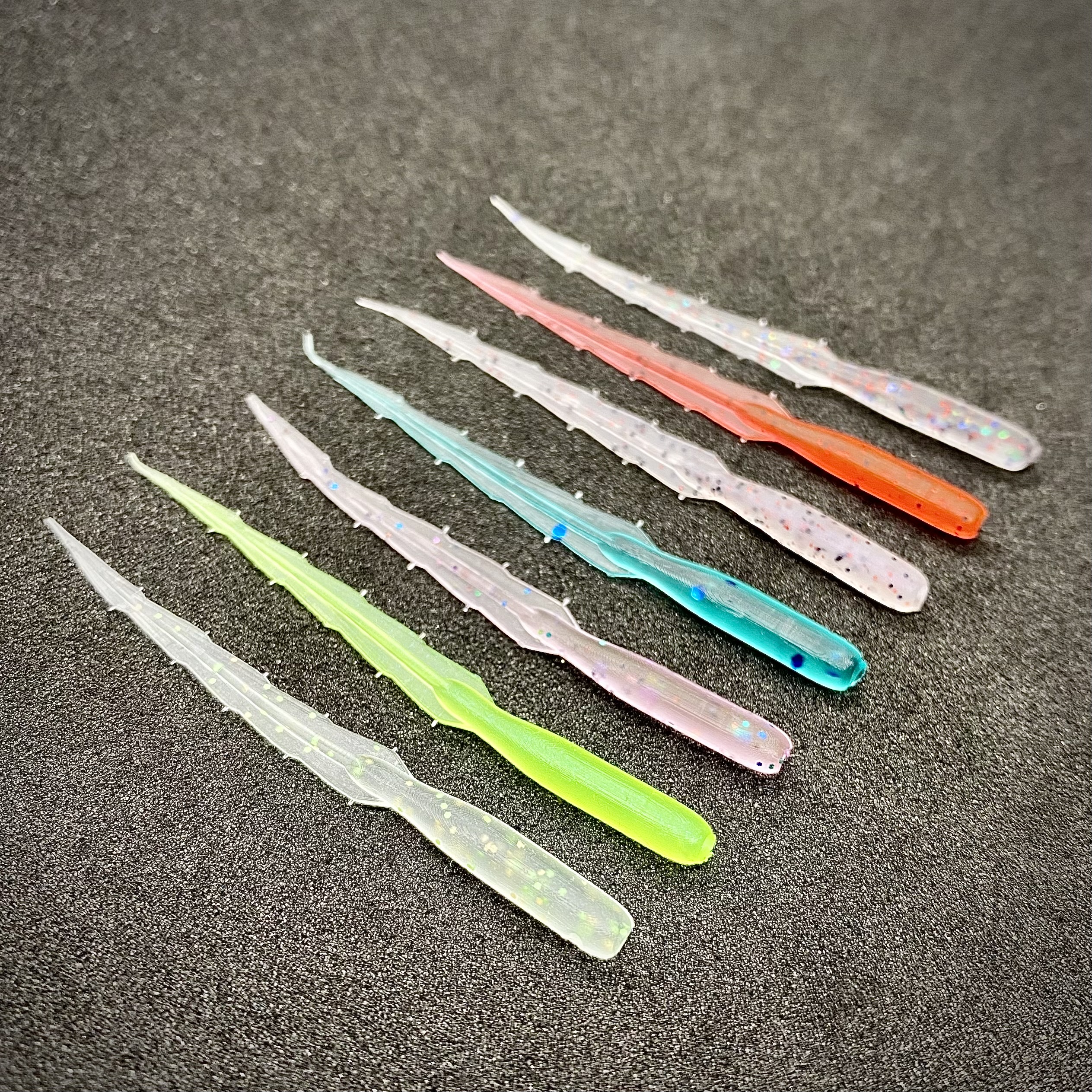 Consta de un cuerpo fino, adaptado a las pequeñas cabezas usadas en el ajing. A este cuerpo le sigue un pequeño estrechamiento para otorgar movilidad y perfil que se ensancha en un pequeño abultamiento para aumentar el movimiento y servir de base al nacimiento de una cola triangular dentada, muy plana y fina.